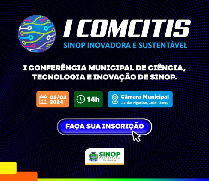 Se aproxima a data da primeira Conferência Municipal de Ciência, Tecnologia e Inovação (COMCITIS). No dia 05 de março, na Câmara Municipal, às 14h, Sinop sediará o evento que vai marcar o início de um novo tempo para o setor, focado no fortalecimento da democratização da inovação e do desenvolvimento tecnológico e sustentável local. A COMCITIS também contará com a participação da comunidade. As inscrições podem ser feitas pelo site oficial da Prefeitura, por meio do link https://sistema.sinop.mt.gov.br/Login/ ou pessoalmente no dia do evento.