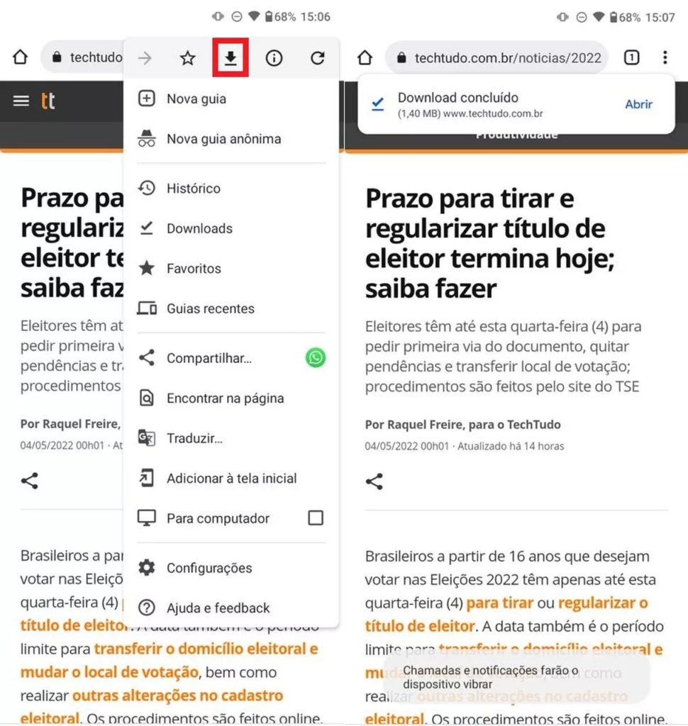 Outro recurso útil do Chrome é o que permite fazer o download de páginas da web para poder ler quando estiver sem internet. Para usar a função, abra qualquer página de um site no Chrome e toque sobre o ícone de reticências, no canto superior direito da tela. Na sequência, aperte no ícone de download, no menu superior da opção, e aguarde até o conteúdo ser baixado. Se quiser consultar a página baixada mais tarde, basta pressionar as reticências e tocar sobre “Downloads”.