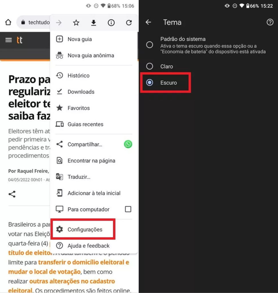 Para ativar o modo noturno do Google Chrome no celular, abra o navegador e toque sobre as reticências, no canto superior da tela. Em seguida, acesse as configurações do app. Lá, procure por “Tema” e, então, selecione a opção “Escuro”.