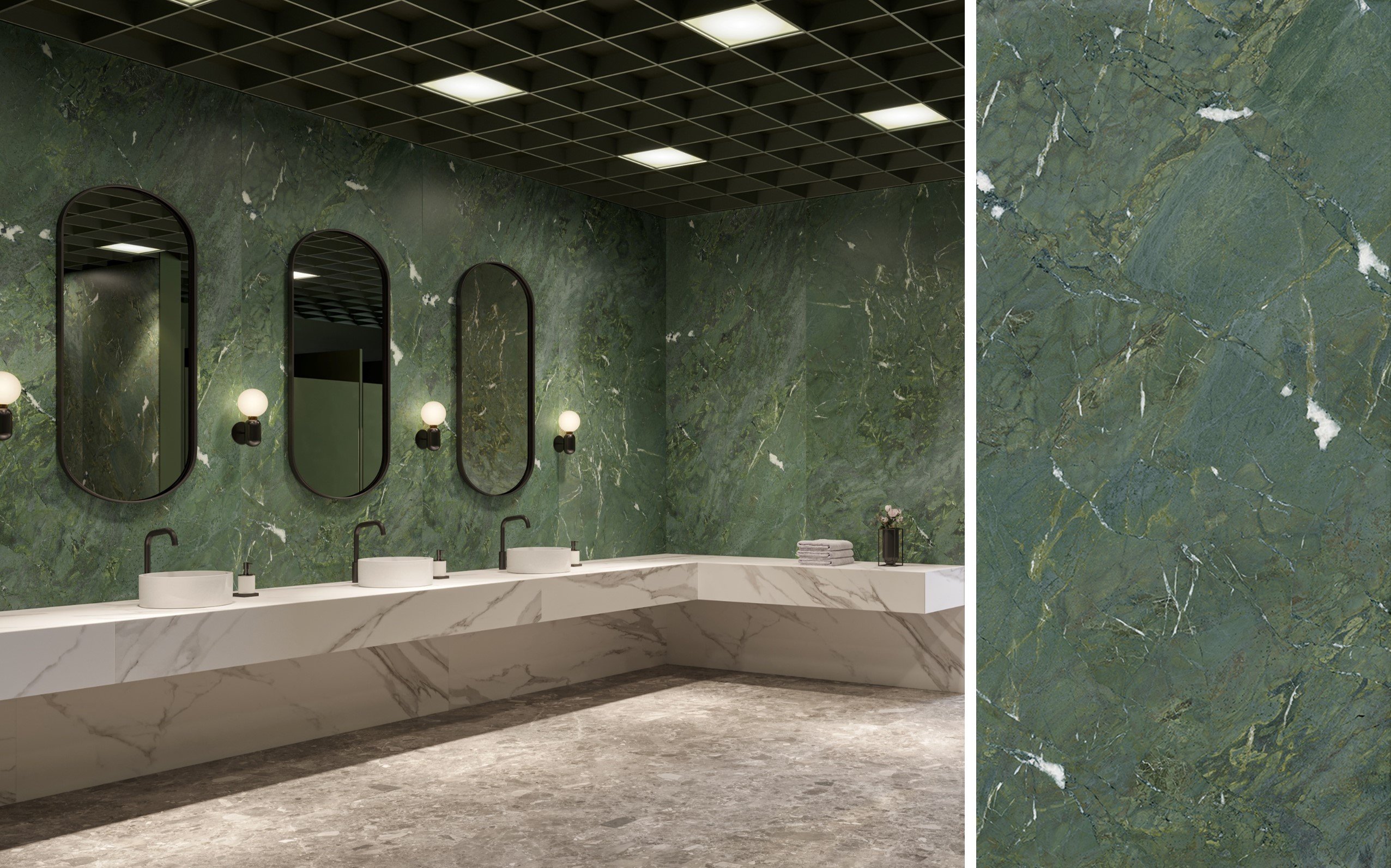 O Mármore Verde Alpi é uma rocha encontrada na região da Itália. De um verde intenso e uniforme, apresenta veios brancos marcantes que contrastam com o fundo. É um dos mármores mais raros encontrados na natureza. Os porcelanatos da Série Alpi no formato 120 x 250 cm são inspirados na pedra e reproduzem todas as nuances e variações de desenho. As lâminas são apresentadas nas versões mate (com toque acetinado) e Micro Crystal (com brilho intenso).