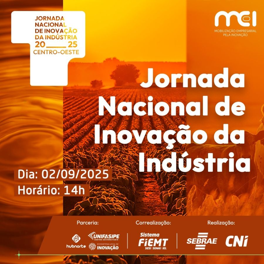 A Confederação Nacional das Indústrias (CNI), oSistema Federação das Indústrias do Estado de Mato Grosso (Fiemt), por meio do Serviço Nacional de Aprendizagem Industrial (Senai MT), e oServiço de Apoio às Micro e Pequenas Empresas do Estado de Mato Grosso (Sebrae/MT) realizam, no dia 2 de setembro, a Jornada Nacional de Inovação, em Sinop. A programação gratuita acontece das 14h às 21h30, na Unifasipe – Centro Universitário, unidade Aquarela das Artes.