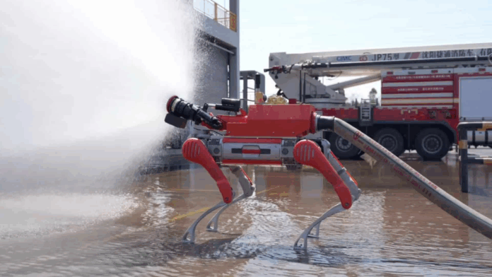 A Unitree apresentou uma versão modificada do seu robô quadrúpede B2, voltada para o combate a incêndios.