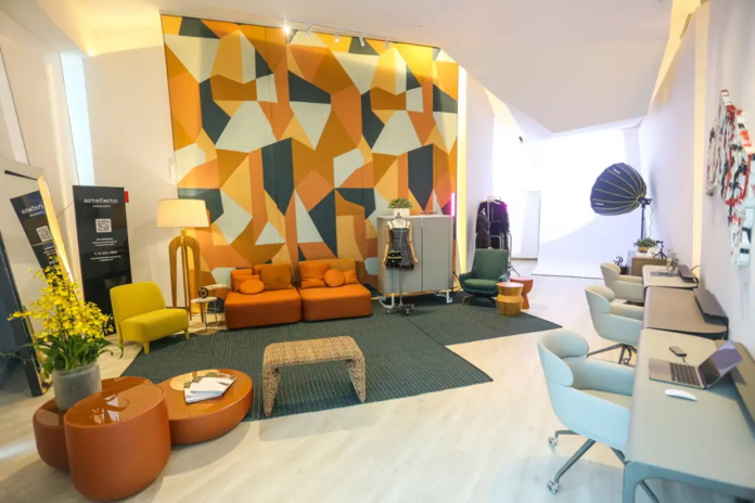 A decoração e o mobiliário contam ainda com a parceria de luminárias Plano de Luz, tapetes da Botteh e uma obra de arte cedida pela galeria Simões de Assis. A peça foi criada pelo artista André Azevedo em 2018 e se trata de uma macrocélula acrílica sobre tela com recorte e costura. Do lado de fora há uma tela que reproduz os conteúdos desenvolvidos pelo Content Lab.