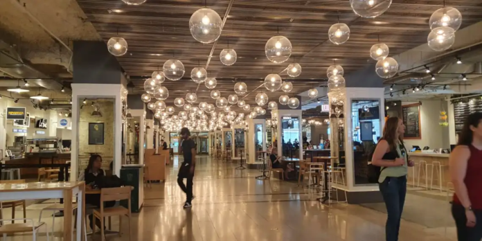 Outro conceito que chama a atenção na arquitetura da cidade norte-americana são os foodcourts, espaços que contam com diversos bares e restaurantes sob o mesmo teto. O Timeout Market é um exemplo de foodcourt, com uma área de mais de 4 mil m² e localizado em um bairro antigo de armazéns, o local conta com restaurantes selecionados a partir da curadoria da revista que dá nome ao estabelecimento.