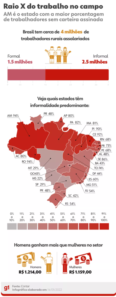 Entre os trabalhadores do campo, cerca de 60% lidam com a agricultura, 28,4% com a pecuária, 4,3% com a pesca e 4,2% com a floresta. A maior parte (44,4%) trabalha por conta própria e 50% não conseguiram completar os estudos, tendo o ensino fundamental incompleto.