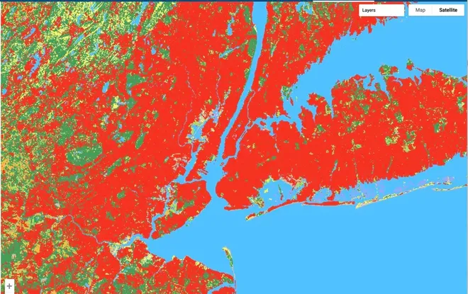 O Google mostrou um print de tela da cidade de Nova York no qual é possível verificar a área construída marcada em vermelho. Alguns bolsões de grama (área verde) e arbustos ou mato alto (amarelo) são visualizados em meio a tudo isso, um indicativo dos parques da cidade.