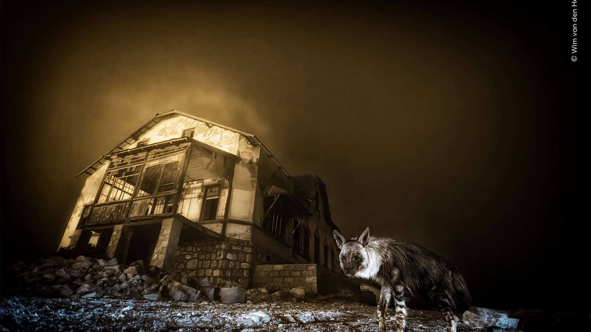 A fotografia vencedora, chamada “Visitante da Cidade Fantasma”, mostra a hiena em frente a um prédio abandonado, iluminada por uma luz suave e fantasmagórica. Para conseguir o registro, o fotógrafo Wim Van den Heever, da África do Sul, passou anos estudando os hábitos do animal e instalou armadilhas fotográficas na cidade fantasma de Kolmanskop.