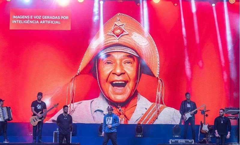Na sequência, o cantor revelou que o iFood, sabendo desse sonho, preparou a surpresa para deixar a festa ainda mais especial. Nesse momento, imagens de Luiz Gonzaga, também produzidas por inteligência artificial, surgiram no telão. Juntos, os dois cantaram a música “Eu tenho a Senha”, de João Gomes. A homenagem, proporcionada pelo uso da tecnologia, teve a autorização da família de Luiz Gonzaga.
