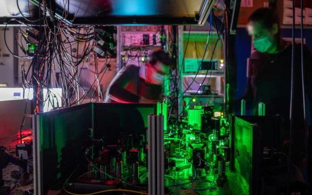 A equipe construiu três desses sistemas quânticos, chamados Alice, Bob e Charlie, e os conectou a uma linha com fios de fibra óptica. Os cientistas conseguiram então emaranhar esses sistemas enviando fótons individuais – partículas de luz – entre eles.