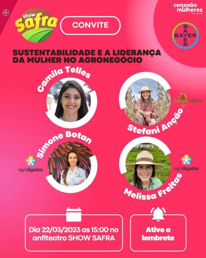 Organizado pela empresa Bayer, o encontro das mulheres contará com palestras de Camila Telles, produtora e influenciadora do agro, da Agro Coach Stefani Anção, que também é membro da Associação Damas da Terra e das Agroligadas Simone Botan e Melissa Freitas.