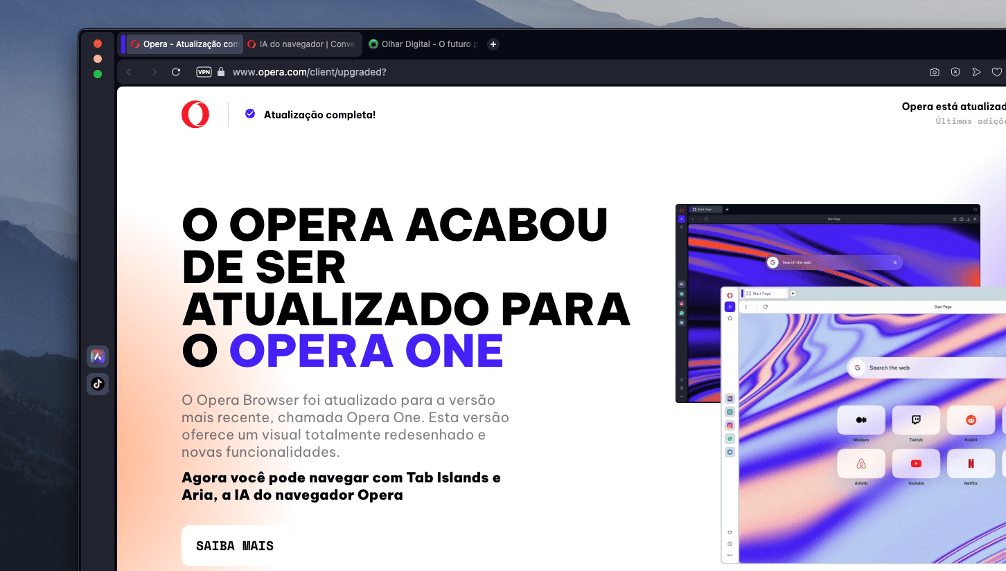 - A grande novidade é a inteligência artificial chamada de Aria, acionada por linha de comando ou com um botão na barra lateral do browser