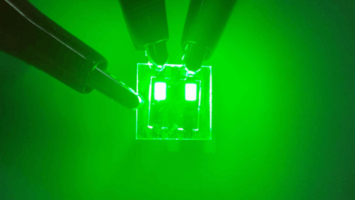 - Saída ultrabrilhante: brilha três vezes mais que os LEDs verdes antigos, atingindo luminância de pico superior a 500.000 cd m⁻²;