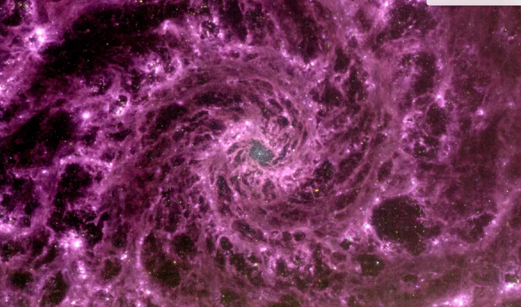 O James Webb nos surpreendeu com uma imagem da galáxia NGC 628, no infravermelho médio, revelando não as estrelas, mas a poeira e o gás ao seu redor. Esse material geralmente bloqueia a luz das estrelas quando observamos em luz visível, mas no infravermelho é dele que surge o brilho.