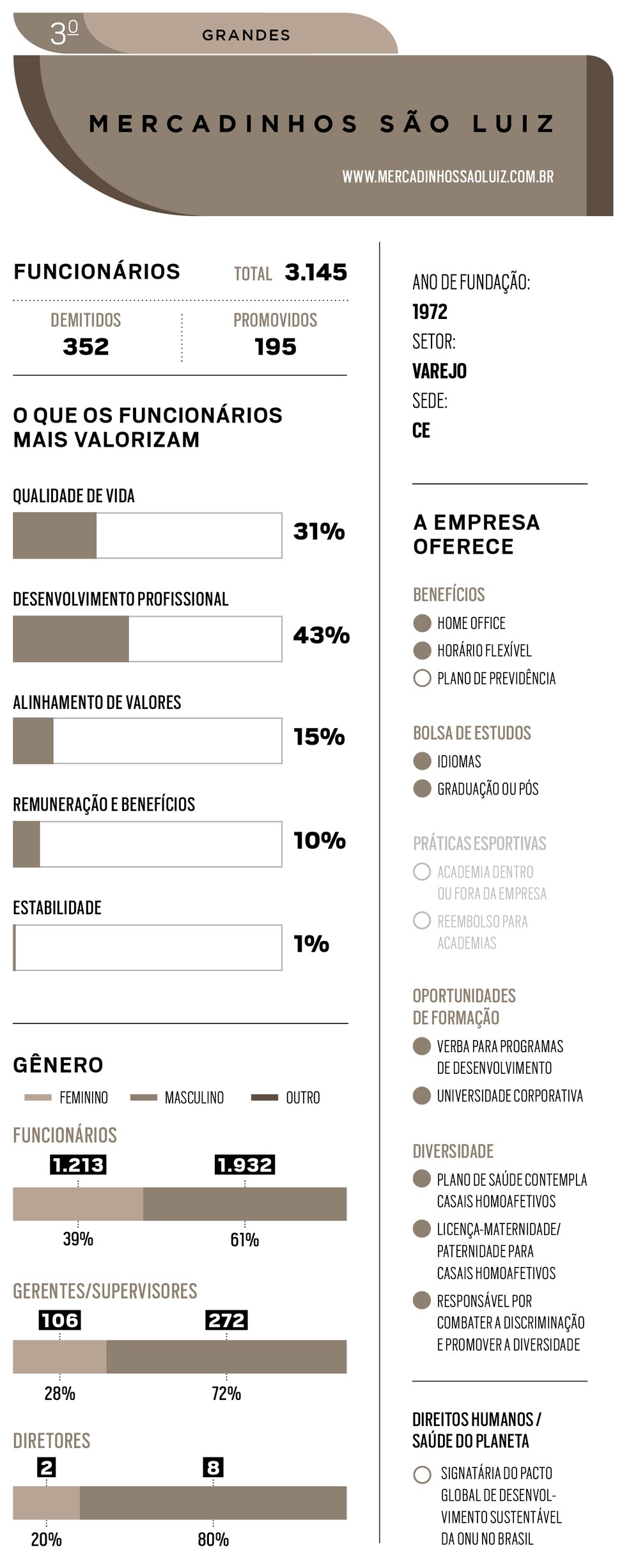 O Grupo São Luiz – varejista cearense que inclui 25 lojas, entre unidades do Mercadinho e do Mercadão São Luiz – sempre se orgulhou de ser uma empresa familiar. Há quase cem anos, mantém uma cultura focada na valorização dos funcionários. “Ao longo do tempo, essa cultura foi sendo lapidada”, diz Severino Ramalho Neto, CEO da companhia entre 2008 e abril deste ano, quando foi substituído pelo irmão Luiz Fernando Ramalho. Fazer parte do ranking do GPTW em anos anteriores ajudou. “Muitas vezes, as avaliações dos funcionários revelaram questões nas quais precisávamos trabalhar”, afirma. Em 2023, o grupo chegou ao posto de melhor empresa de varejo para trabalhar. Segundo Neto, o prêmio só reforçou o que praticavam no dia a dia. “Pagamos os melhores salários do mercado, e o funcionário enxerga que pode crescer, como aconteceu com 95% das lideranças aqui”, diz o executivo. Neto destaca que, nas avaliações feitas nas lojas, além de checar se os clientes estão satisfeitos, observam também os funcionários. “Temos os mesmos cuidados com clientes e equipe. Não existe uma coisa sem a outra”, afirma.