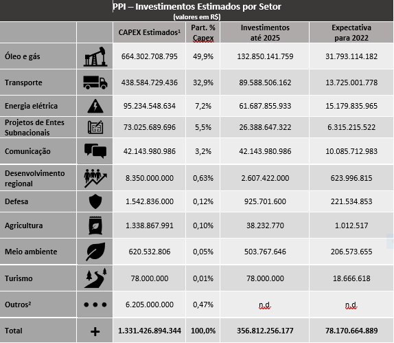 Na avaliação setorial, a SPE ressalta que cinco setores são responsáveis pela quase totalidade dos investimentos programados no PPI: óleo e gás (49,9% do total); transporte (32,9%); energia elétrica (7,2%); projetos de entes subnacionais (5,5%); e comunicação (3,2%).