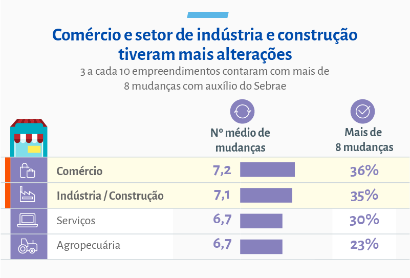 Dos setores averiguados, o Comércio registrou o maior número médio de mudanças na empresa em decorrência do acompanhamento do Sebrae, alcançando uma média 7,2, e 97% dos entrevistados desse segmento aplicaram, pelo menos, uma inovação na empresa. No entendimento de Arthur, “todos os setores possuem facilidade para inovar. O que muda é justamente o tipo de inovação. O setor de Indústria realiza mais inovação em seus produtos. Já os setores de comércio e serviços realizam muitas inovações na área de marketing. As inovações de processos, por sua vez, costumam ocorrer em todos os setores, com destaque para os pequenos produtores rurais, que têm inovado bastante em sua produção”.