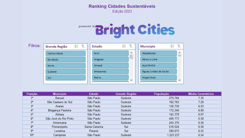 A Bright Cities é uma plataforma de diagnóstico para cidades que trabalha com mais de 100 indicadores relacionados à ISO 37120 e Objetivos do Desenvolvimento Sustentável (ODS) da Organização das Nações Unidas (ONU). As cinco primeiras colocadas no ranking, pela ordem, são Barueri, São Caetano do Sul, Araras, Bragança Paulista e Atibaia.