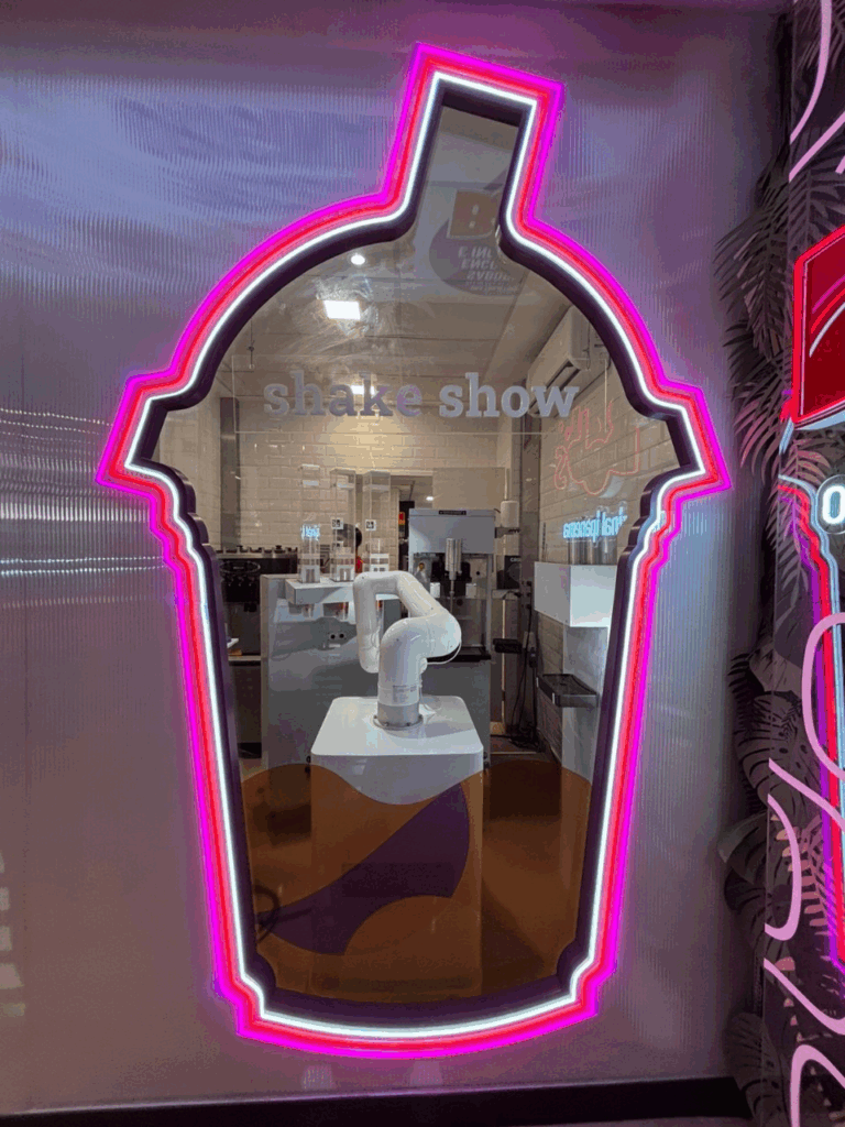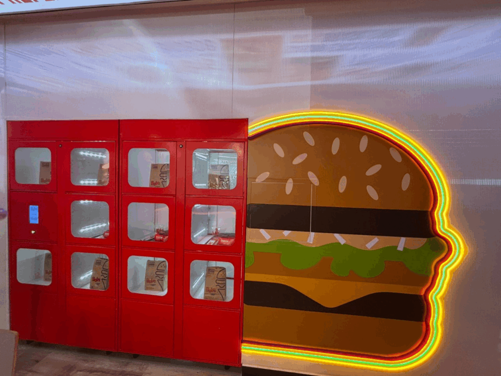 Além do robô, que é um dos destaques da unidade, a loja conta com uma linha do tempo que relembra momentos marcantes da rede e um Green Wall — revestimento decorativo sustentável feito de folhas estilizadas em lã de PET reciclado, que dá personalidade ao ambiente com uma aparência orgânica.
