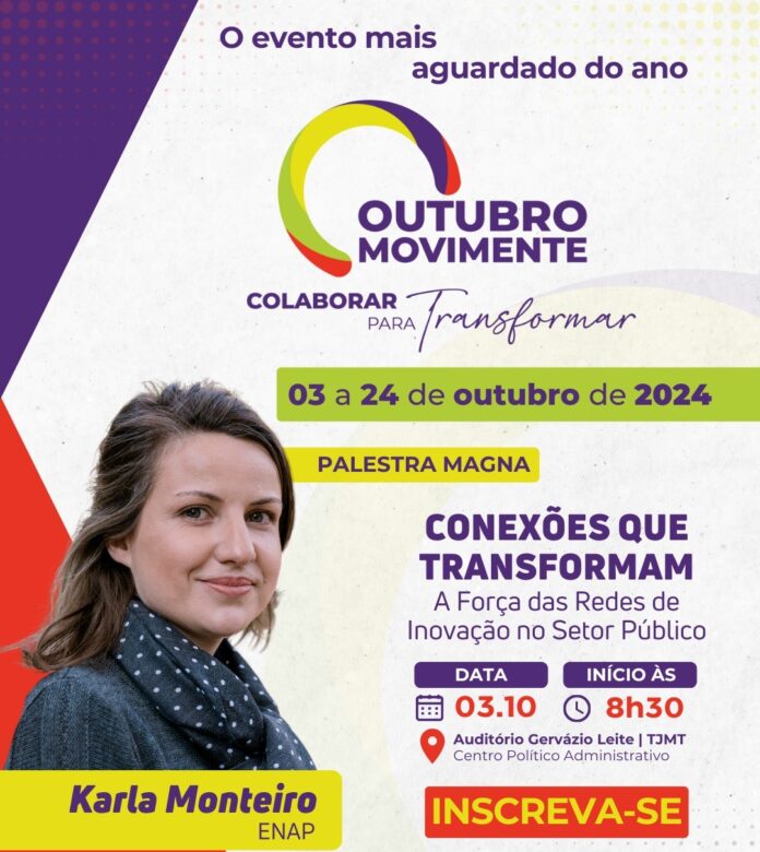 A Secretaria de Estado de Planejamento e Gestão (Seplag) realiza, nesta quinta-feira (03.10), a abertura do “Outubro Movimente”. A iniciativa estimula ações destinadas à promoção da inovação para a transformação dos serviços públicos. A cerimônia está marcada às 8h, no auditório do Tribunal de Justiça de Mato Grosso (TJMT), sendo possível a participação presencial ou remota.