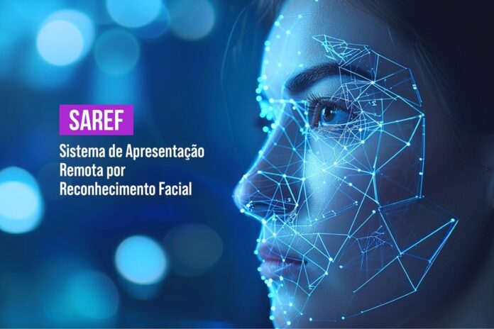 #ParaTodosVerem – Esta matéria possui recurso de texto alternativo para promover a inclusão de pessoas com deficiência visual. Imagem 1: Fundo desfocado com luzes azuis e brancas, criando um efeito de bokeh que transmite uma sensação digital. No lado esquerdo, há um retângulo magenta com o texto “SAREF” e abaixo “Sistema de Apresentação por Reconhecimento Facial”. No lado direito, há o rosto de uma mulher marcado por pontos nodais ligados por linhas, simbolizando o escaneamento facial.