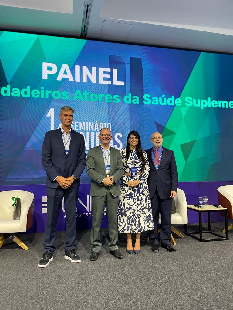 Estavam presentes na mesa o presidente do Conselho de Administração da Abramed, Wilson Shcolnik; o diretor de Tecnologia e Informação da Associação Paulista de Medicina (APM) e presidente da comissão organizadora do Global Summit Telemedicine & Digital Health, Antonio Carlos Endrigo; o gerente executivo da CASSI, Everton Nunes – que moderou o debate, e a diretora de contratos do Grupo Hapvida Notredame Intermédica, Nathalia Pompeu.