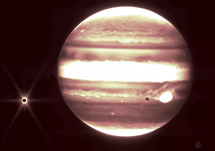 O telescópio espacial internacional James Webb capturou as primeiras fotos de Júpiter e de sua lua nesta quinta-feira (14).