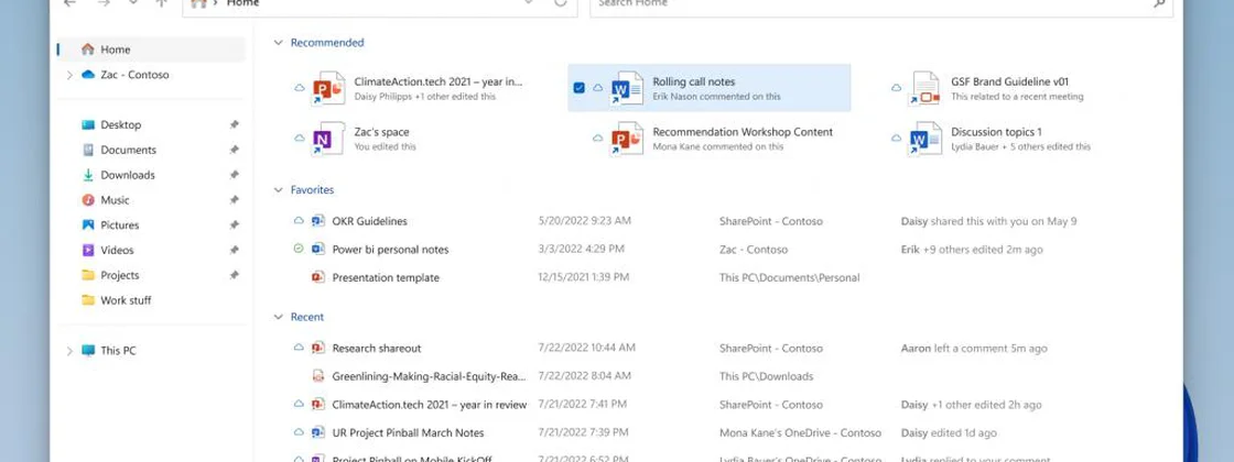 A Microsoft está testando um novo recurso chamado “File Recommendations”, que sugere arquivos específicos para abrir quando o usuário visita a guia inicial do File Explorer. Os arquivos recomendados estarão associados à conta do usuário no Azure Active Directory (AAD), que podem ser de propriedade do usuário ou compartilhados com ele.